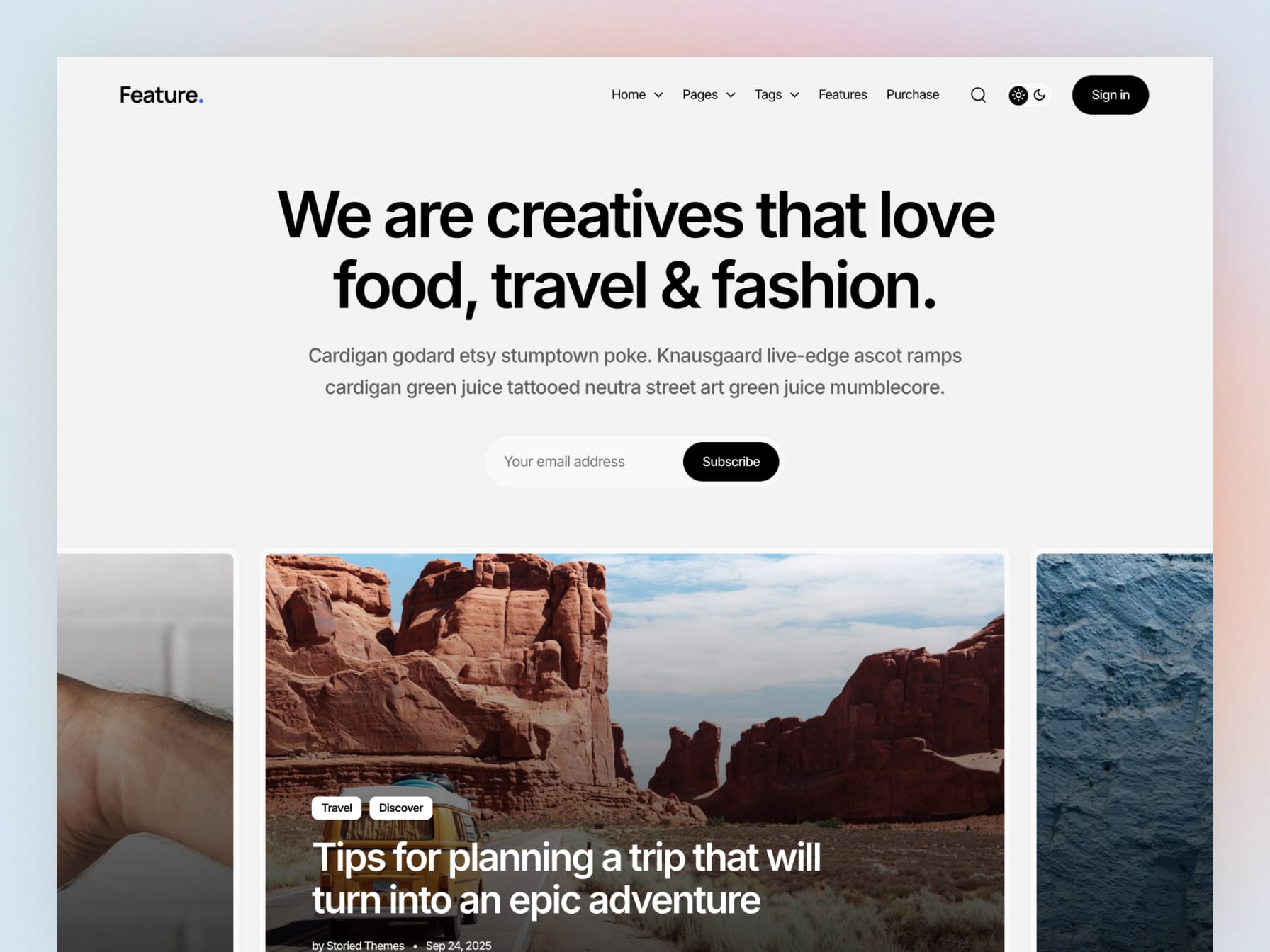 The Feature Theme is a sleek and modern Ghost theme designed to showcase your content with style and functionality. This theme leverages many of Ghost's powerful built-in features while adding its own unique enhancements.